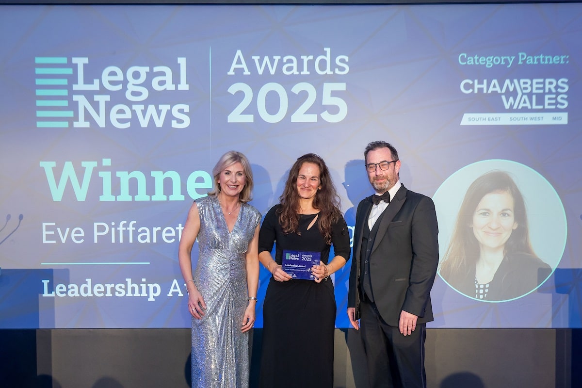 Award winning: Eve Piffaretti (centre) receiving the Leadership Award at the Legal News Wales Awards 2025. Photo courtesy of Matthew Horwood.